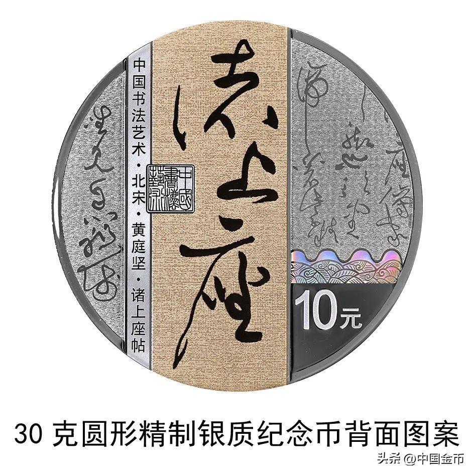 30克圆形银质纪念币背面图案为北宋黄庭坚书《诸上座帖》局部文字及“诸上座”字样与笔架、“中国书法艺术”篆刻钤印等组合设计,并刊“中国书法艺术·北宋·黄庭坚·诸上座帖”字样及面额。
