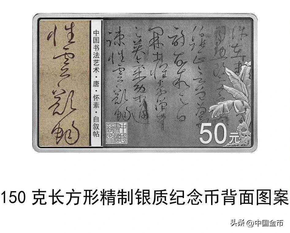 150克长方形银质纪念币背面图案为唐代怀素书《自叙帖》局部文字及“性灵豁畅”字样与芭蕉、石头、“中国书法艺术”篆刻钤印等组合设计,并刊“中国书法艺术·唐·怀素·自叙帖”字样及面额。