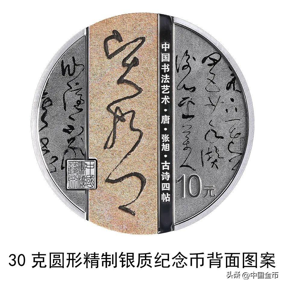 30克圆形银质纪念币背面图案为唐代张旭书《古诗四帖》局部文字及“贤哲”字样与“中国书法艺术”篆刻钤印等组合设计,并刊“中国书法艺术·唐·张旭·古诗四帖”字样及面额。