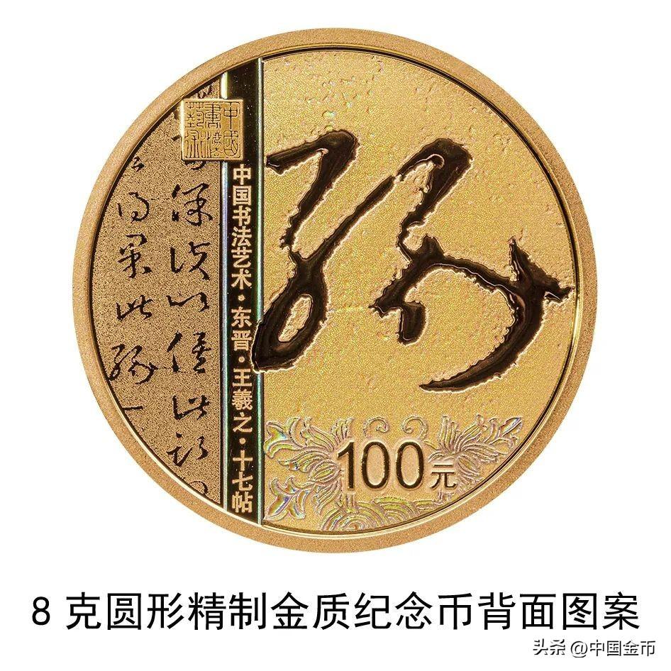 8克圆形金质纪念币背面图案为东晋王羲之书《十七帖》局部文字及“缘”字样与装饰纹样、“中国书法艺术”篆刻钤印等组合设计,并刊“中国书法艺术·东晋·王羲之·十七帖”字样及面额。