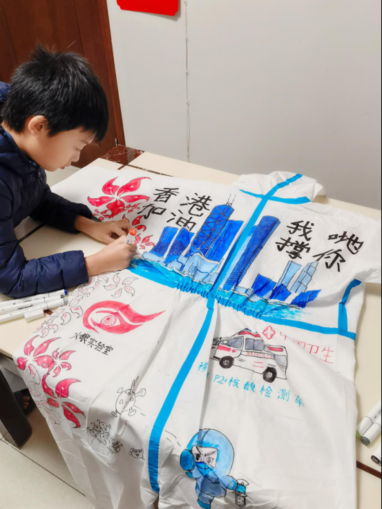 连日来,深圳市龙岗区台港澳事务局、深圳市大美青少年成长发展指导中心组织上百名青少年儿童参与支援香港抗疫主题绘画创作,并将甄选出15优秀作品绘制在防护服上,用画作支持正在抗击疫情的香港同胞,致敬逆行出征的内地援港抗疫专家。