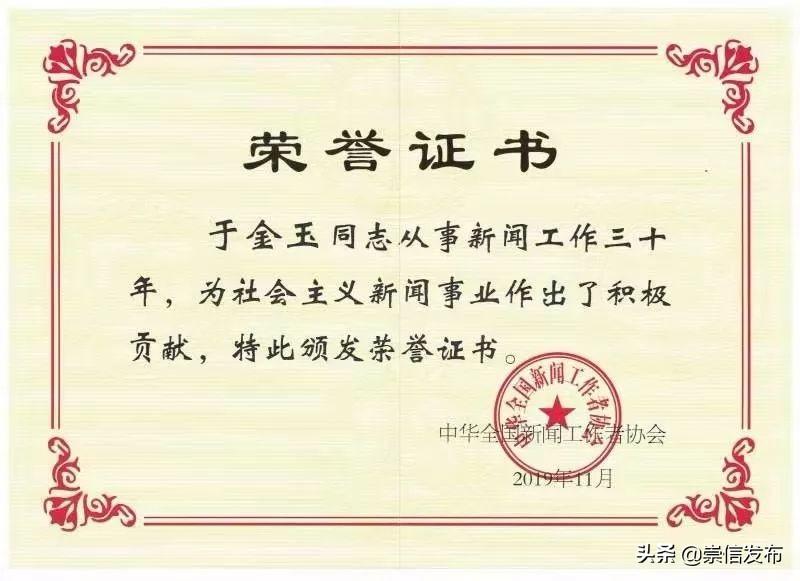 近日,崇信县融媒体中心主任记者于金玉同志获得了由中华全国新闻工作者协会颁发的《从事新闻工作三十年》荣誉证书和证章。