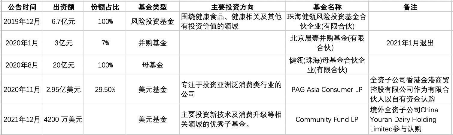 2020年11月,伊利股份全资子公司香港金港商贸控股有限公司,拟作为有限合伙人以自有资金认购PAG Asia Consumer LP基金份额,认缴出资额为2.95亿美元,约占投资基金29.5%的份额,该基金专注于投资亚洲泛消费类行业的公司。